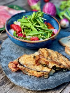 Farcite le melanzane: mozzarella fiordilatte a fette, prosciutto cotto, foglia di basilico e chiudete con uno stecchino. Impanate passandole prima nella farina (va bene anche di riso per gli intolleranti al glutine) e poi nelle uova e friggete.