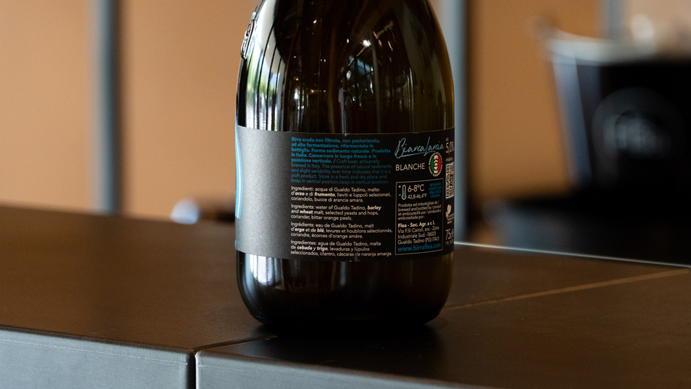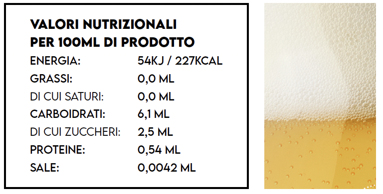 Water from Gualdo Tadino, barley and wheat malt, hops, yeast, coriander, bitter orange peel.